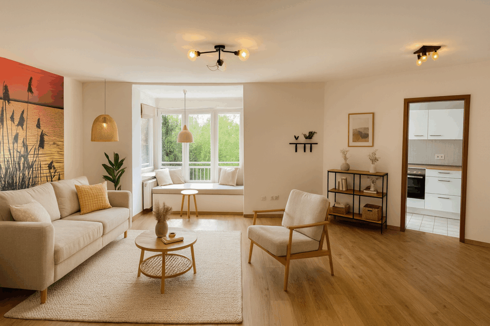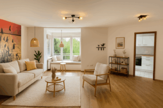 Das helle Wohnzimmer bietet großzügige Platzverhältnisse und eine charmante Nische, die ideal als Lese- oder Arbeitsbereich genutzt werden kann. Von hier aus gelangen Sie auf den französischen Balkon, der der Wohnung zusätzliches Flair verleiht. Das separate Schlafzimmer bietet Rückzugsmöglichkeiten, während das modern ausgestattete Badezimmer sowohl mit Badewanne als auch mit Dusche überzeugt.